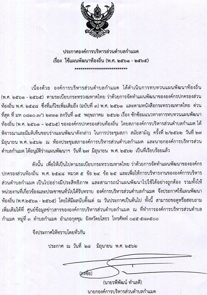 ประกาศองค์การบริหารส่วนตำบลกำแมดเรื่องใช้แผนพัฒนาท้องถิ่น(พ.ศ.2561-2565)