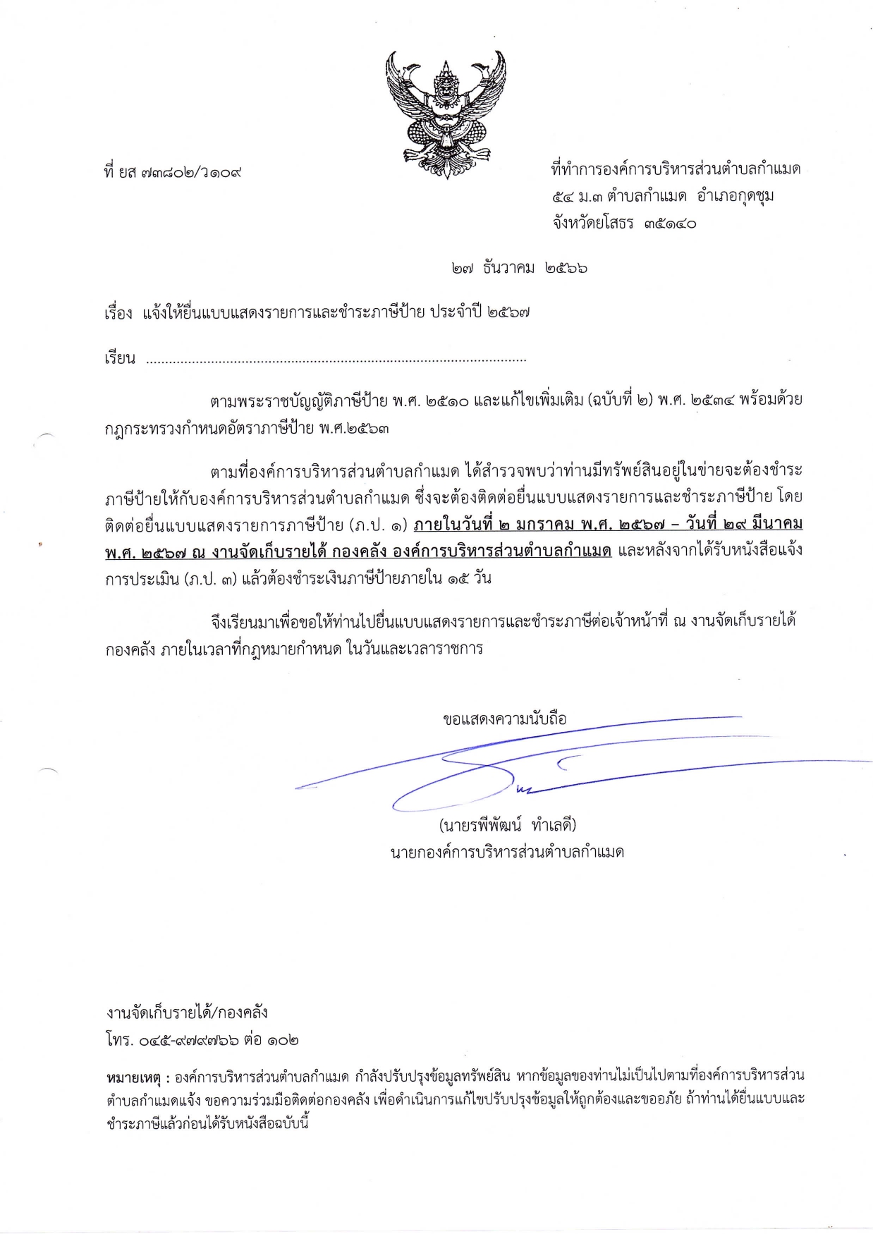 แจ้งให้ยื่นแบบแสดงรายการและชำระภาษีป้าย ประจำปี 2567
